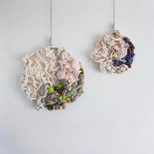 紐や水引などの繊維やその端材を用い、マクラメや飾り結びの伝統的な技法を独自の感性で再構築。